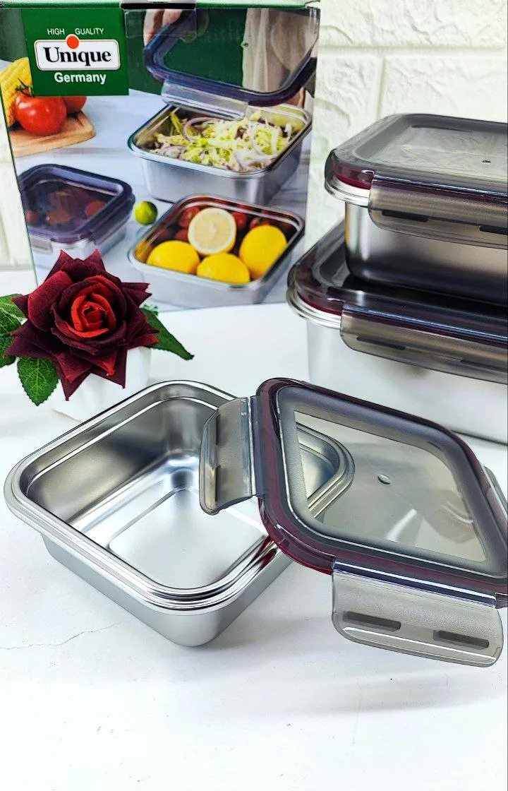 ظرف 3 تیکه یخچالی فریزری استیل یونیک مدل مربعی قفل دار