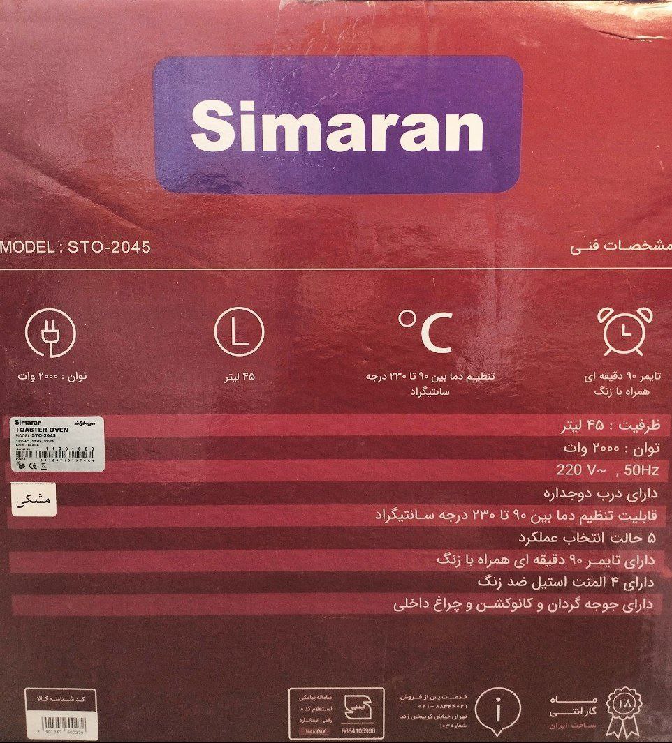 Simaran toaste Oven model STO 2045دیگران را با نوشتن نظرات خود، برای انتخاب این محصول راهنمایی کنید.